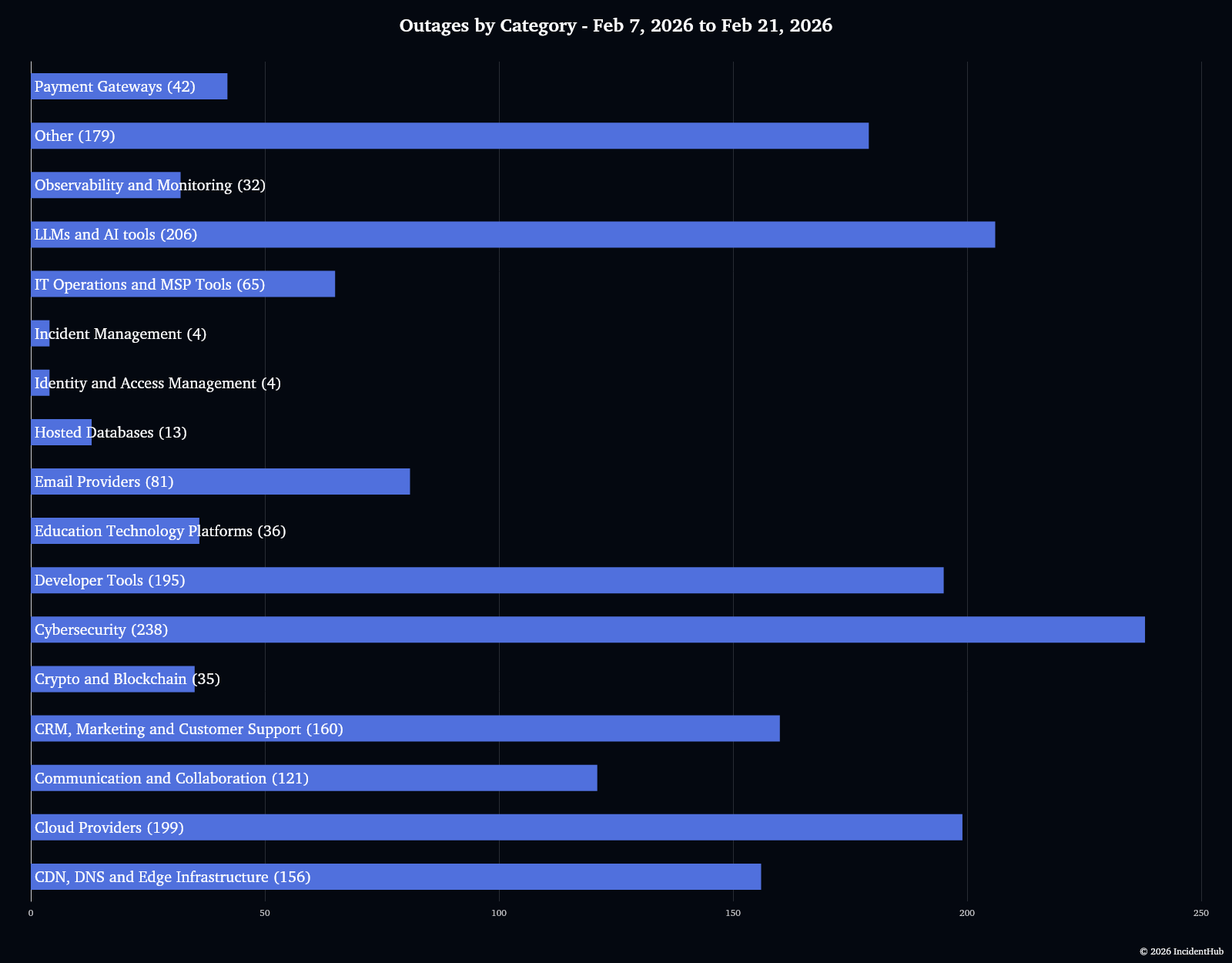 Visualizations and tabular data in this newsletter are derived from IncidentHub’s third-party status monitoring. IncidentHub monitors status pages of hundreds of SaaS and Cloud services.